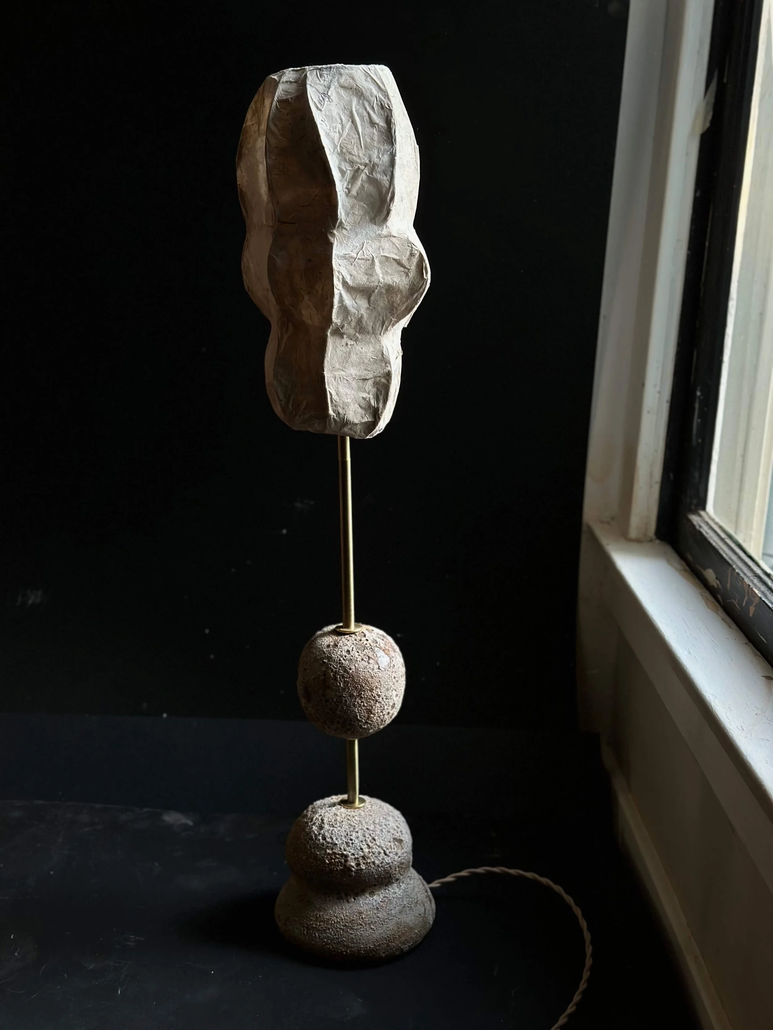 This handmade lamp functions as both a light source and a sculptural object. Its abstract, organic form—resembling a plant or natural growth—features soft curves and rounded shapes. The rough, textured surface shows layered folds, emphasizing its hand-built, artisanal quality.